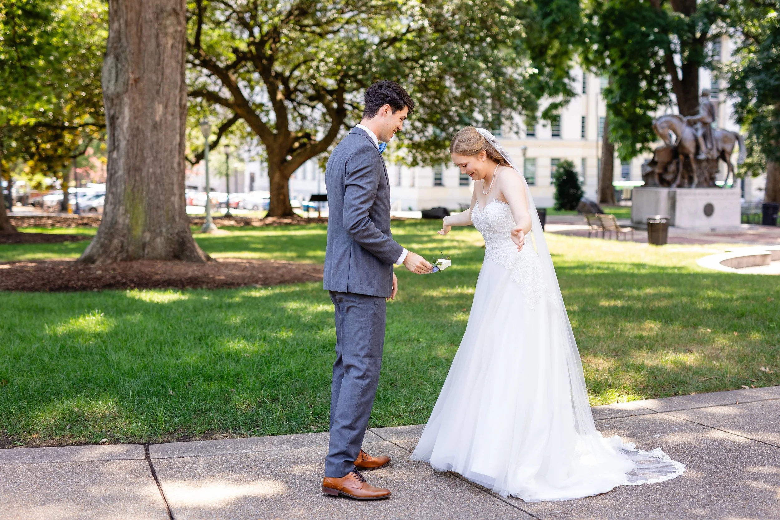 We met the couple in the soft morning light at the Capitol. The stone steps and classical columns made a simple, timeless backdrop for that first moment. There’s an intimacy to a first look in a public place—a private pause amid the hum of the city. They took a few minutes to breathe together, read one another’s expressions, and settle into the day. After those initial moments, we took advantage of the nearby architecture for portraits that felt grounded and true to color—clean lines, natural tones, and the gentle warmth that comes from being relaxed and present.