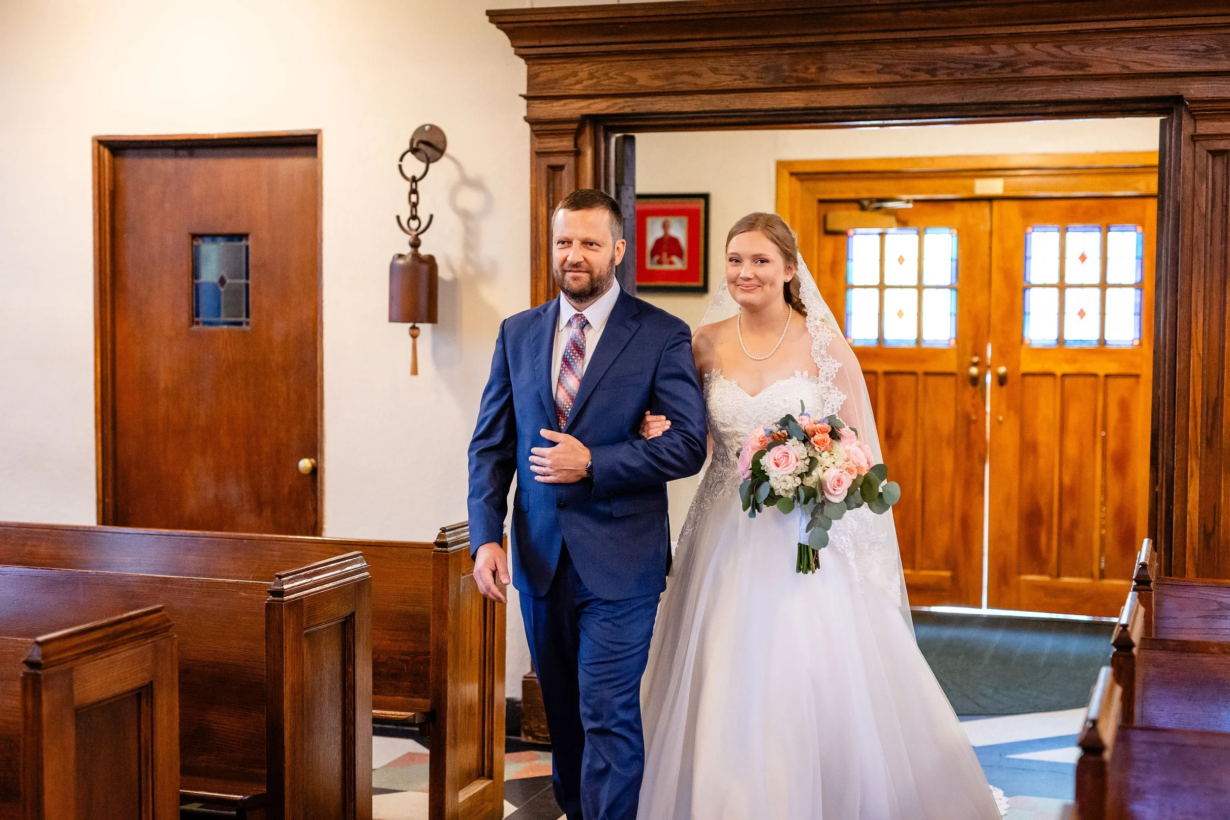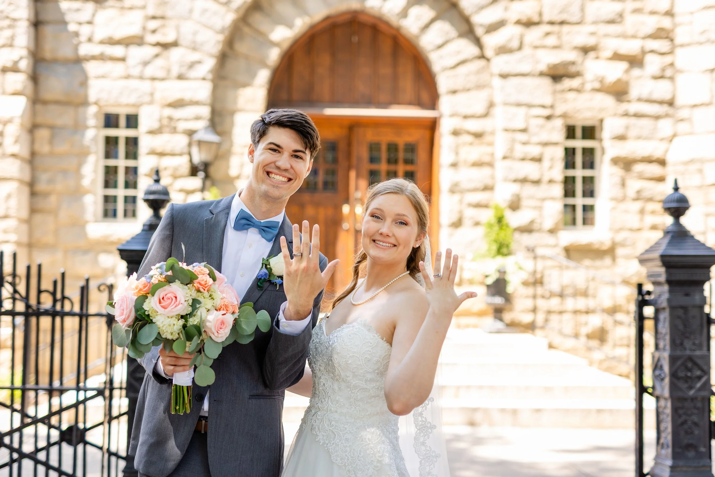 After the recessional, we stepped outside to take advantage of the church’s classic façade and the late afternoon light. The stonework and stained-glass windows gave a rich, textured backdrop for portraits that feel both elegant and approachable. We guided the couple through a few relaxed poses, encouraging movement and natural connection so their love could show authentically on camera. The result was a series of images that balance formality with feeling—timeless, true-to-color portraits that will age beautifully.